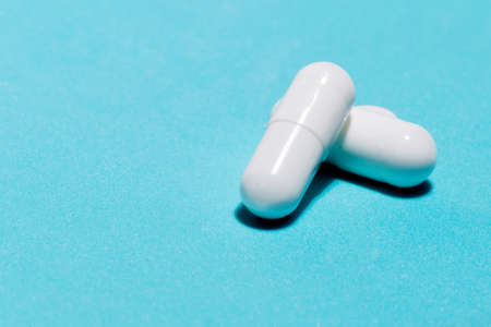 White red pill capsule on a blue background. Minimalism, medical concept, top view