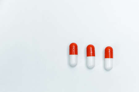 three red and white medical capsules on a white background.