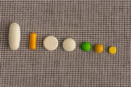 Tablets and capsules arranged by size. Medicine and treatment concept