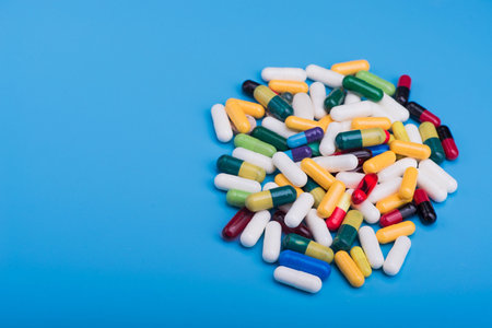 Several assorted prescription pills, medicine and drugs on a blue studio background with copy space