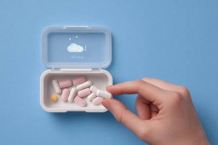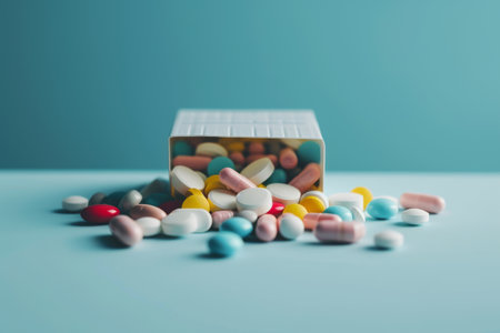 Colorful pills spilling from a weekly pill organizer box, reminding patients to take daily medication. pillbox
