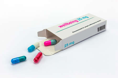 Open medicine packet labelled wellbeing opened at one end to display a blister pack of tablets, isolated on white
