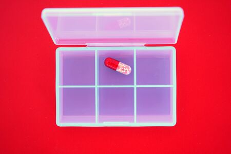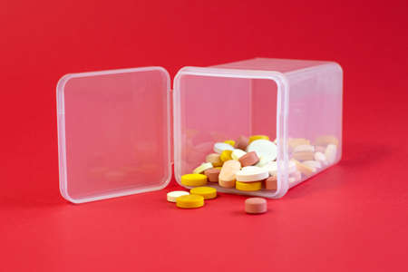 Pill box with colorful pills and vitamins. Plastic red container with cells for medicines. health concept. Selective focus, close-up.