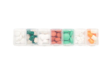 top view of medical pills in a pill box on white background