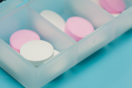 Tablets and pills in a plastic box on a white background.