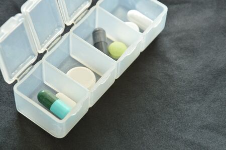 Pill box daily take a medicine, with colorful pills, tablets, and capsules.