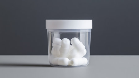 medicine capsule pill near bottle container on table for medication drug treatment or abuse concept