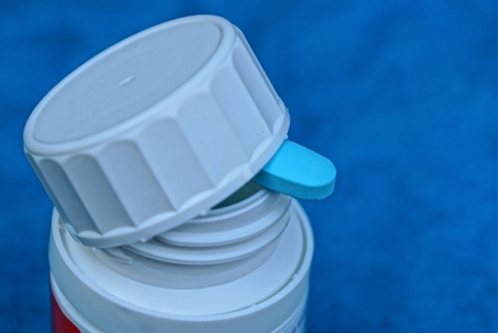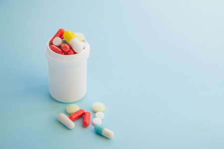 White medicine bottle, red and white pills on a blue background. Top view, copy space, selective focus
