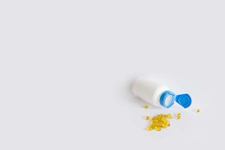 Yellow oil capsules with vitamin D, omega poured from a plastic white bottle. Healthy diet concept