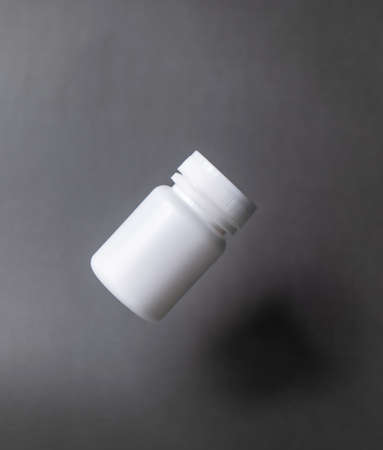 White plastic pill bottle, unlabelled, capped, floating on a black background.