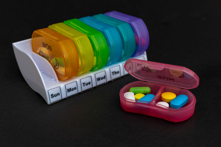 Colorful pills spilling from a weekly pill organizer box, reminding patients to take daily medication. pillbox