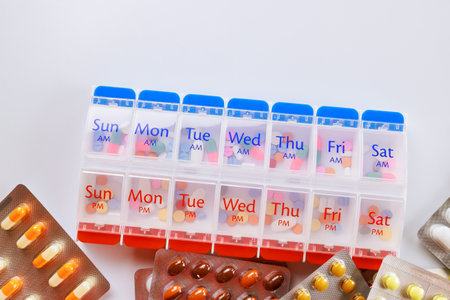 Weekly pill organizer with various medication on light background