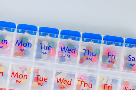 Weekly pill organizer with labeled compartments for daily medication doses. Concept of health management and medication planning. High quality photo