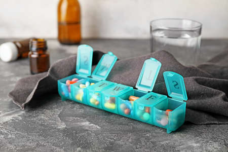 Dispenser for pills and tablets on the table. Unsharp background. Closeup.