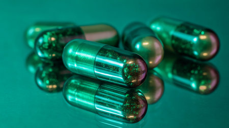 Green and yellow medical capsules on a green background.