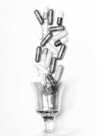 Medicinal drugs and medications. Colorful caplets spill over glass. Medications isolated on white