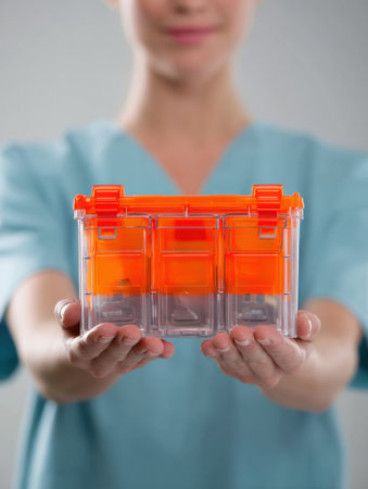Healthcare professional presents a transparent, lockable medication container designed for safe storage and transport of medical supplies.