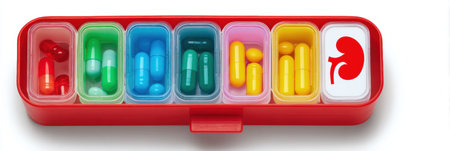 Brightly colored pill organizer is displayed with a striking red kidney icon, showing capsules of various colors for easy daily medication management.