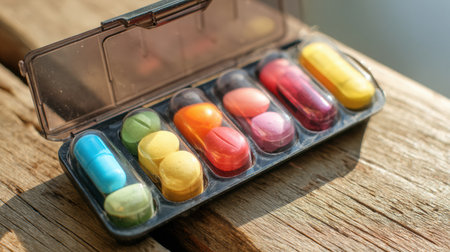 A vibrant array of capsules and tablets is neatly arranged in a portable pill organizer on a wooden table under natural light.