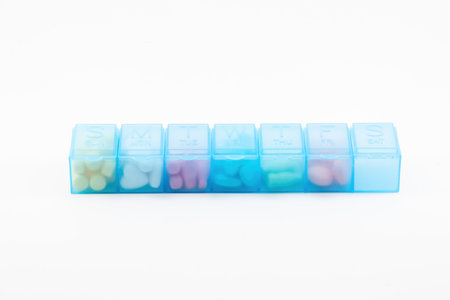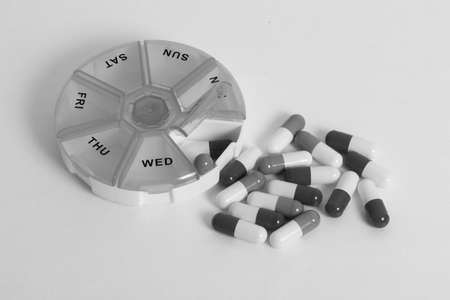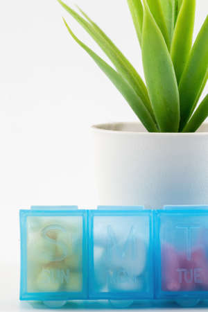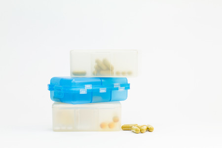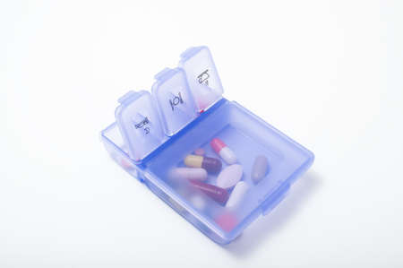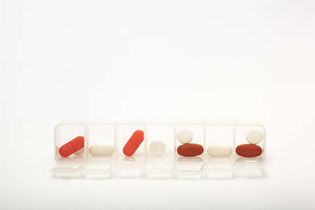 Organizer daily pill dispenser box with medications capsules on white isolated background.
