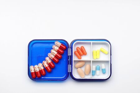 Capsules lie in a pill box on a white background. Box for packing tablets for a week. home for every tablet