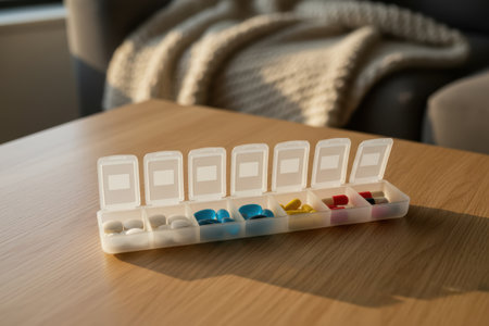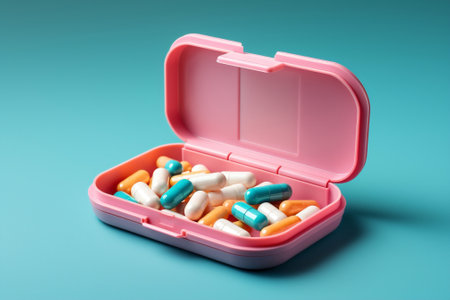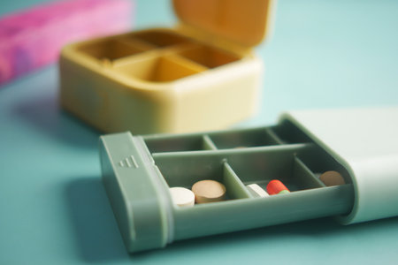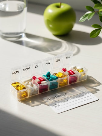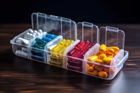 pill organizers vibrant capsules and tablets are arranged meticulously on sleek marble countertop, promoting organized approach daily medication management
