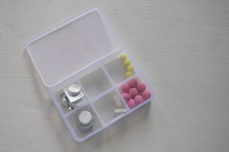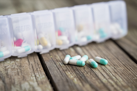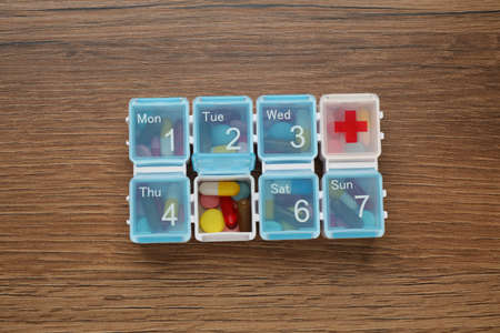 Variety of pills in white plastic pill organizer on weathered wood, Drugs in medical container. Box on wooden background.free space for text