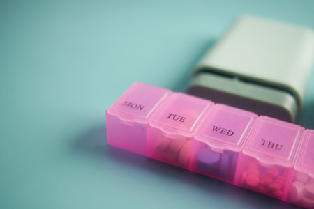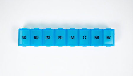 A transparent pill organizer filled with tablets for each day of the week, photographed on a neutral background for themes of daily medication management
