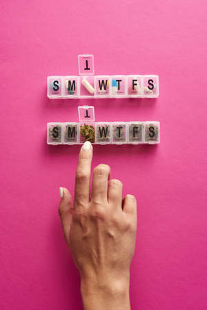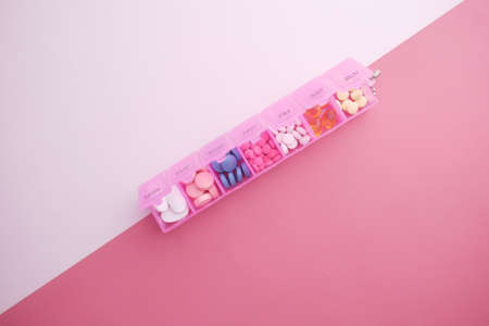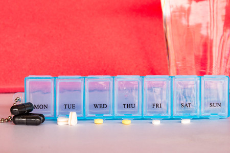 Plastic container for storing pills. Organization of storage of tablets for each day.