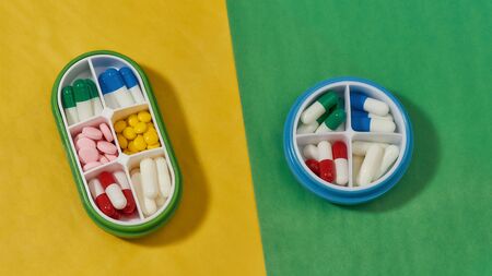 Top view of containers for pills with different medicines. Pill organizer box storing doses of daily medicine on yellow, green background