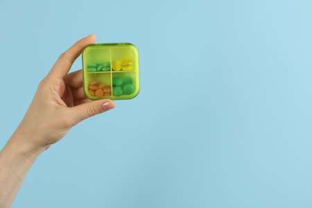 Woman holding plastic box with different pills on light blue background, closeup. Space for text