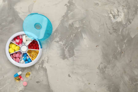 Plastic box and different pills on light gray stone table, flat lay. Space for text