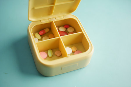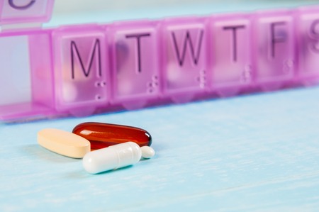 variety of pills in blue plastic pill organizer on weathered blue wood