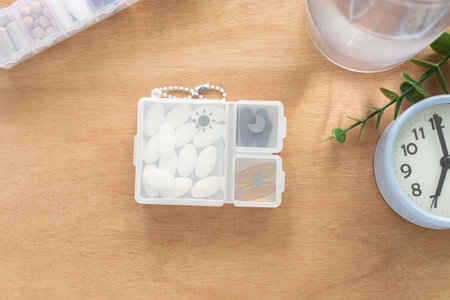 Dietary supplement tablets in plastic box with compartments, water bottle, clock on wooden background, Top view, Health care, pharmacology and minimal medical concept.