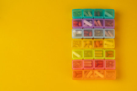 Medicine and health concept. Multicolored pill organizers with different pills, supplements, on yellow background with top view. Organizer for multivitamins, capsules, health supplements.