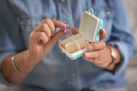 Close up of senior woman holding tablet case and taking pills at night, copy space