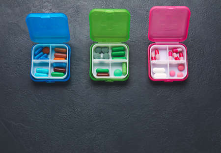 Plastic containers for storage and everyday use of tablets, pill boxes with colorful pills