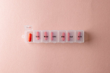 Composition of red pills in weekly pill box on pink background with copy space. Medicine, medical services, healthcare and health awareness concept.