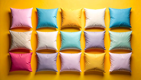 A neat grid arrangement of fifteen colorful square cushions displayed on a bright yellow background.