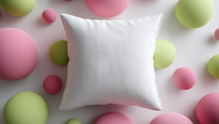 A square white pillow sits centrally among scattered pink and green spheres against a white backdrop. The soft, textured pillow contrasts with the smooth, round shapes. Overhead lighting creates highlights and shadows. This image is suitable for product presentation, advertising, and various design applications.