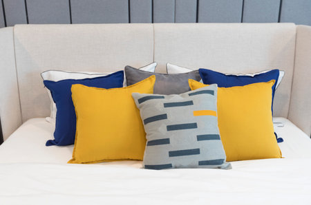 modern bedroom with set of pillows on bed, interior design concept decoration