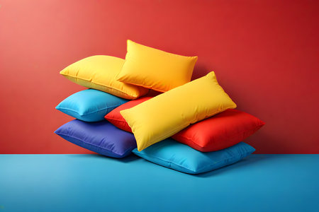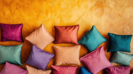 A striking array of colorful cushions arranged against a vibrant wall, showcasing various textures and hues. Perfect for interior decor inspiration.