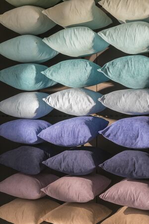 Multi-colored pillows background. Creative background made of pillows. Purple, blue, beige, gray pillows. vacation concept. vertical photo.