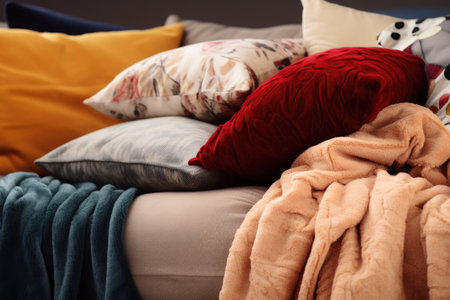 A bed with a rainbow of pillows. The pillows are all different colors and sizes, creating a vibrant and cheerful atmosphere. Concept of warmth and comfort