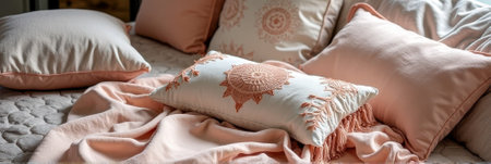 Cozy bedroom scene with decorative peach cushions and textured bedding. That the image is generated using AI.