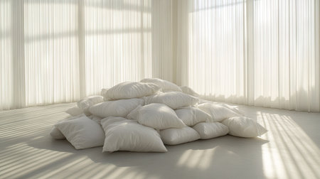 A large pile of pristine white pillows placed on the floor in front of a large window with sheer curtains, sunlight streaming in softly.