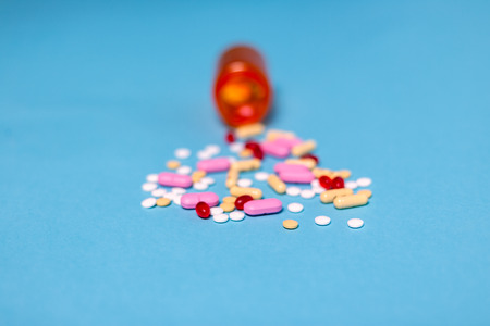 Close up of many different pills on blue background.