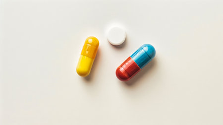 Pharmaceutical capsules over white backdrop.