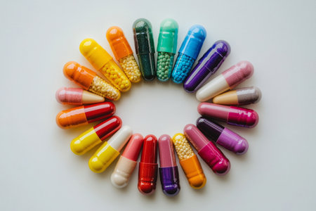 Assorted colorful capsules forming a circle on white surface