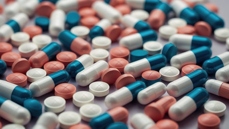 A colorful assortment of pills scattered on a table. The pills are of various shapes and sizes, and they are all mixed together. Concept of chaos and disorder